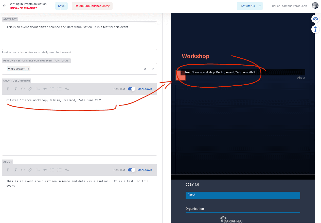 11.Once the event is saved, if you are entirely happy with it, you can move it on to Review’ to publish by clicking on the ‘Set Status’ button in the top right-hand of the screen and clicking on ‘In Review’. Alternatively, once the event is saved, you can click the arrow in the top left-hand corner to create more resources. You can return to change the status by clicking on ‘Workflow’ in the top menu, and clicking on the draft event.