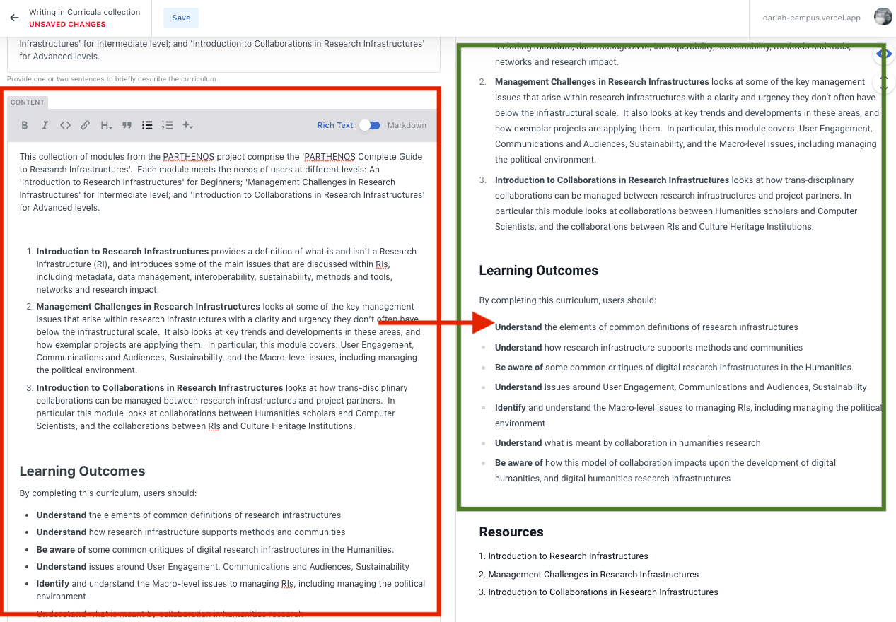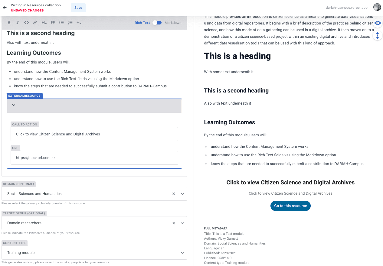 The following walk-through is specific to the Rich Text option, but even if you choose to use Markdown, there are some requirements. These are listed at the end. Users can toggle between Rich Text and Markdown, which can be a useful feature, particularly when it comes to the resource type templates.