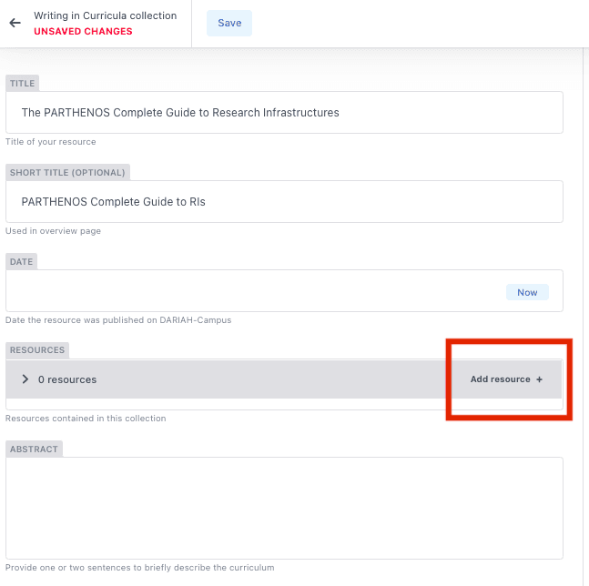 3. The ‘Abstract’ is a required field, as this is what shows up in the listings of resources on the main DARIAH-Campus page. You will not see a preview of this here, so it’s important that you make sure everything in this is correct, check for any spelling errors and/or typos. The abstract should be no longer than around 50 words, and should indicate to a potential student what they will learn within the resource.