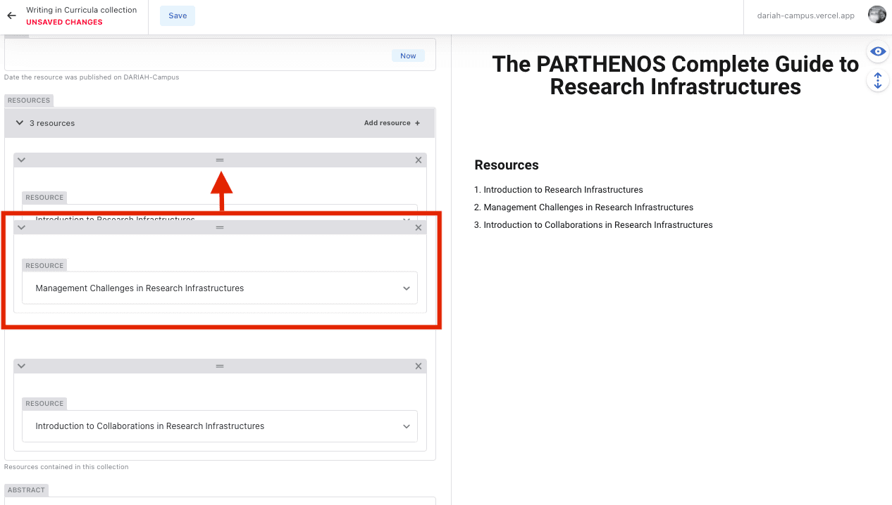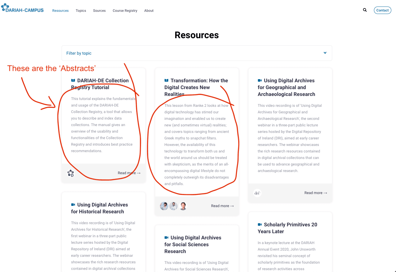 The Resources you want to include in your Curriculum can be selected from the existing list of published materials on DARIAH-Campus.