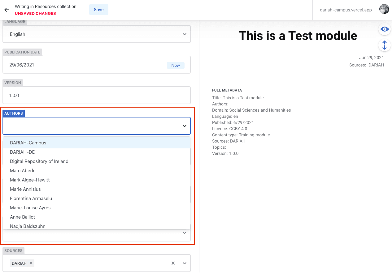 1. ‘Sources’ are by default listed as ‘DARIAH’. If you think that you are going to have a large number of resources added to DARIAH-Campus, then you can speak to us about setting up a channel within the ‘Sources’. However, if this is among the first of the resources you will be submitting, we ask you to leave this as ‘DARIAH’ for now, and we can discuss the option of adding a dedicated source for you. Resources can then be switched over to your source channel retrospectively.
