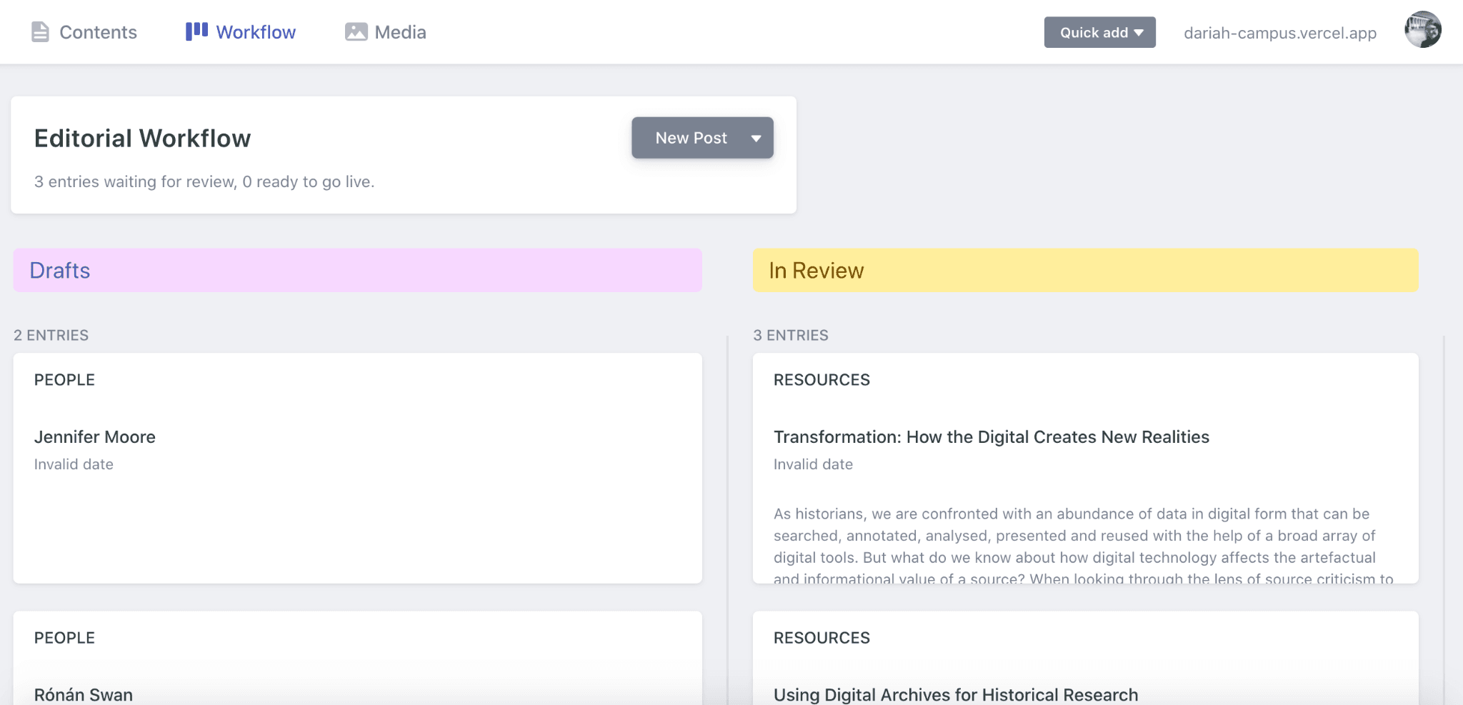 The ‘Workflow’ page shows you what you have saved as a draft (in the left-hand column), and what you have sent for publication that is waiting to be approved by the administrators (on the right-hand side). More on this later.