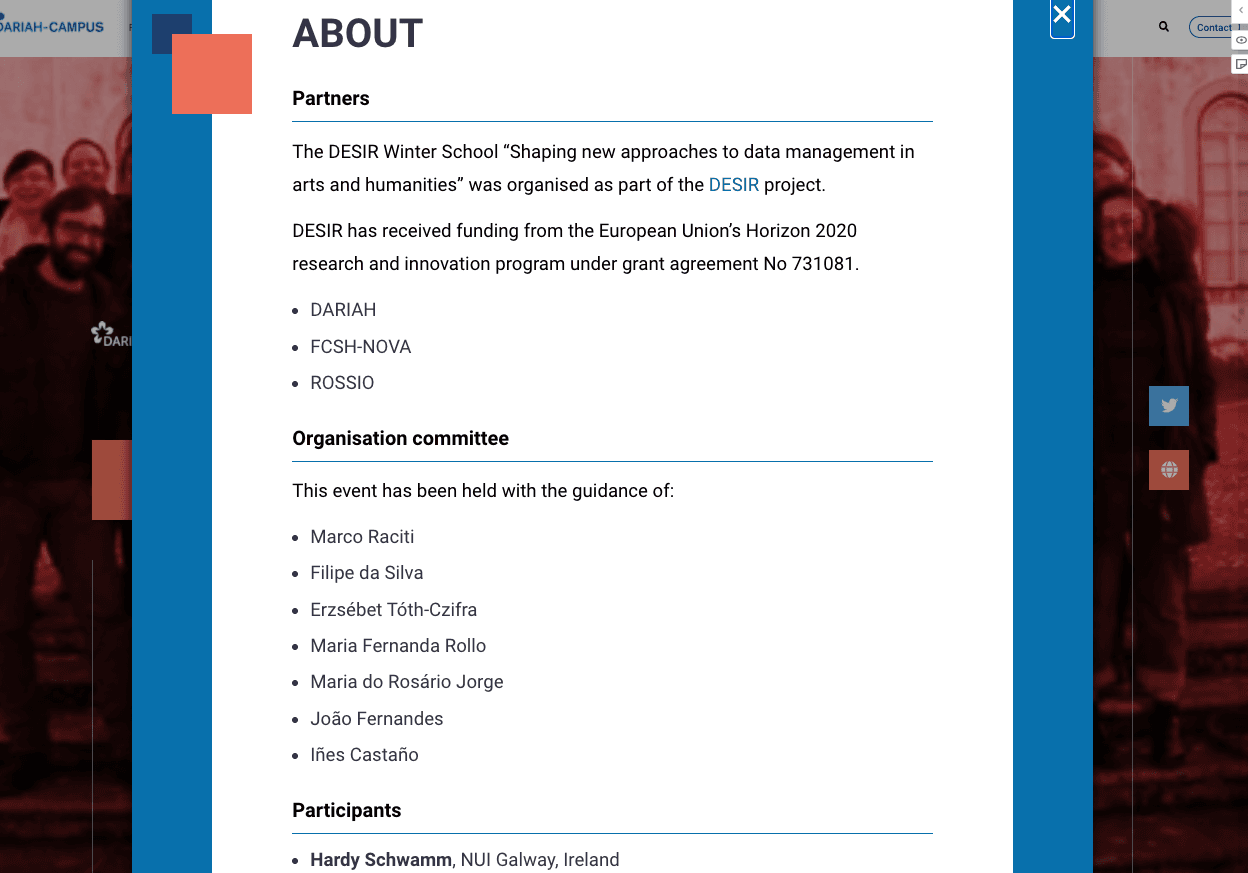 1. The ‘About’ field is another field that doesn’t show up in the Preview Pane. This is because this is a pop-up window on the main site. This field can be used to provide a bit more context for the event, give details about the organisation committee, any funding that was received to support the training event, a link to a project website, and if you want to you can also include a list of attendees. An example of this from one of the existing events is given below: