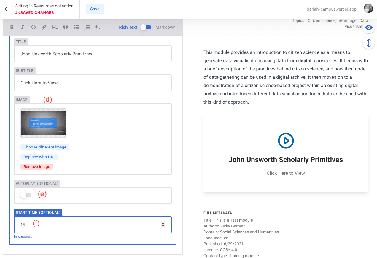 d) You will need to add an image to this. We recommend a screengrab from the video, or if you used a thumbnail in YouTube or Vimeo you can also add that here.