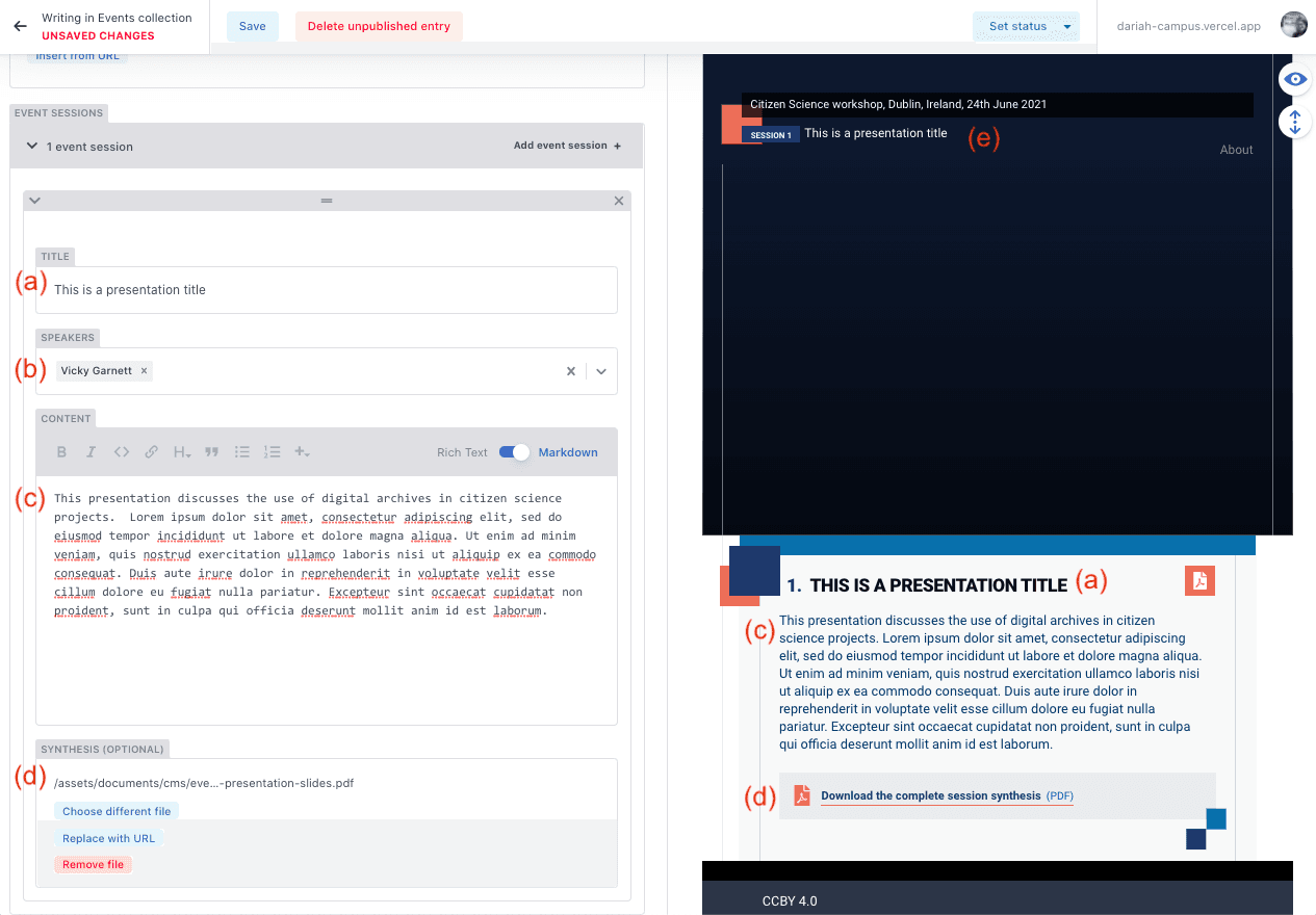 2. This will bring you to a page with a form with two columns: a form on the left hand side, and a preview panel on the right. As you add items, you will see that the preview panel will start to display them so you can see how they will show up on the main DARIAH-Campus site.