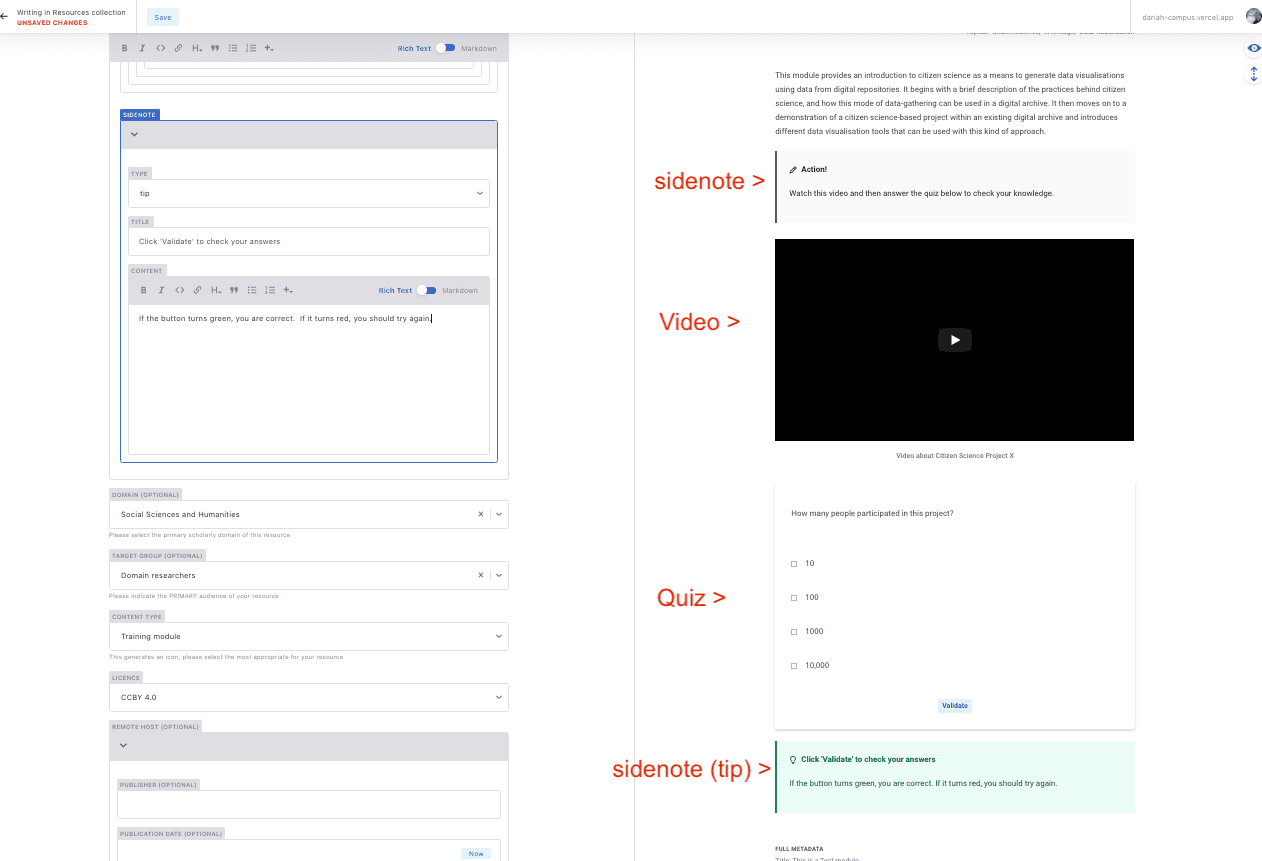 If you are putting together a new Hosted Resource, you can combine as many of these Resource Types as you like. Here you can see an example of different resources combined to create a video and a quiz with sidenotes: