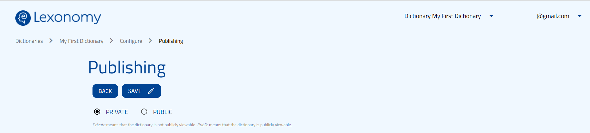To publish your dictionary, go into the Configure menu, click Publishing, and select Public. From the moment you click Save, your dictionary will be visible to anyone who knows its URL.
