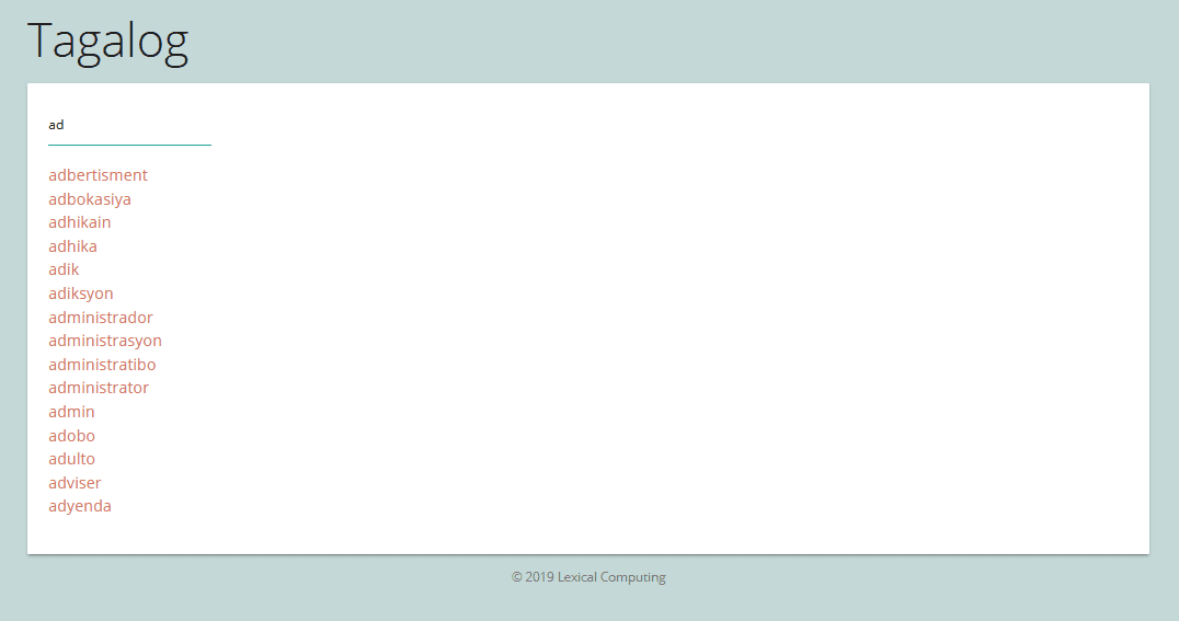Visitors are presented with the displayed name of the dictionary, a search bar and the first words of the dictionary. If you start to type in a word, the word list will gradually reduce so that you will only see entries that start with the same letters as those typed into the search bar. Let’s see words that start with ‘ad’…