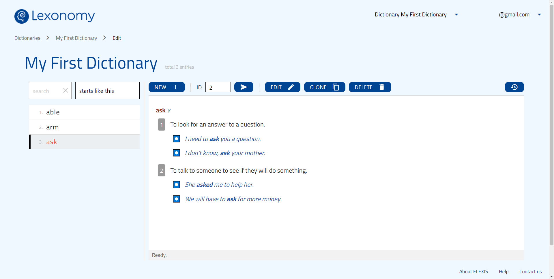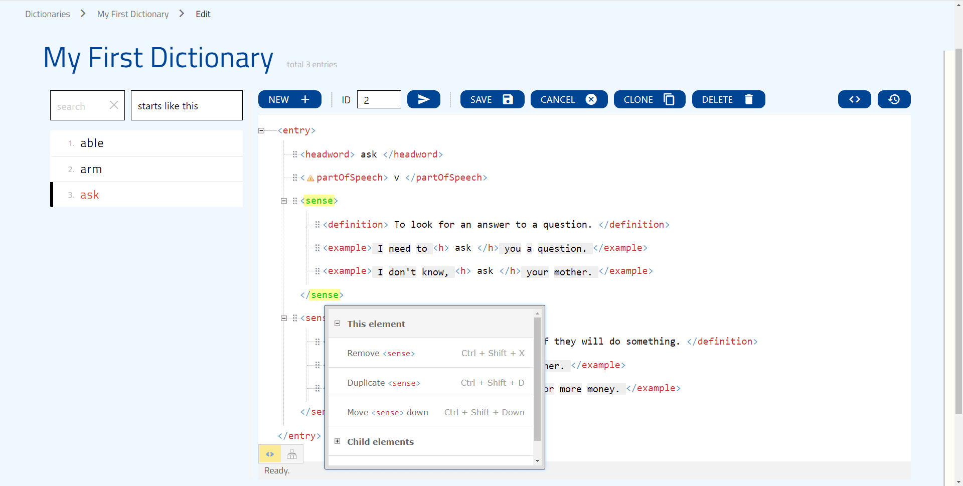 Now you can see what the entry would look like if you decided to publish your dictionary through the Lexonomy servers right away. This is also where you can create and modify the entries in your dictionary: you can edit the entry (by clicking Edit), duplicate it (by clicking Clone) and delete it (Delete). Note that you cannot modify the ID of the entry, the ID bar is only for finding entries.