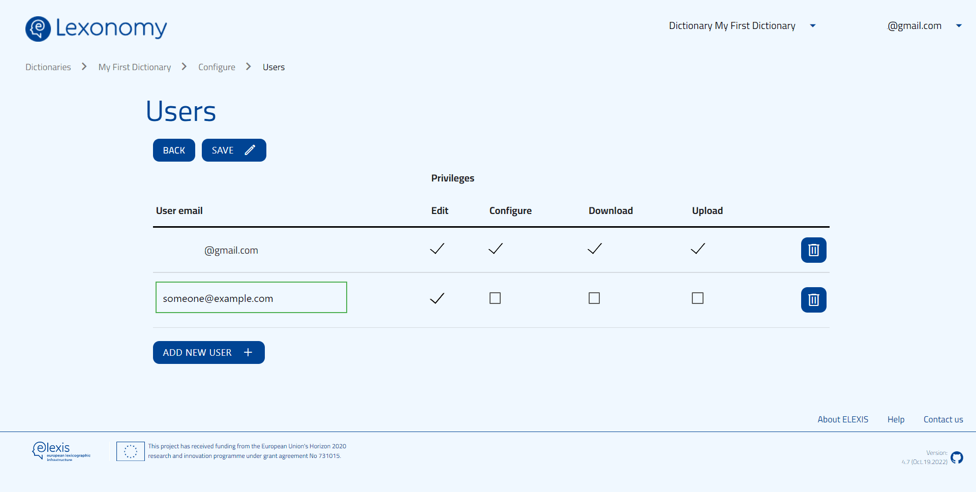 Here, you will see a list of email addresses. These are all the users of Lexonomy that currently have access to the dictionary you have been working on so far. To add another user, type the e-mail address they used to sign up to Lexonomy into the text box and click Add. You can also specify the level of access you want to give to them:
