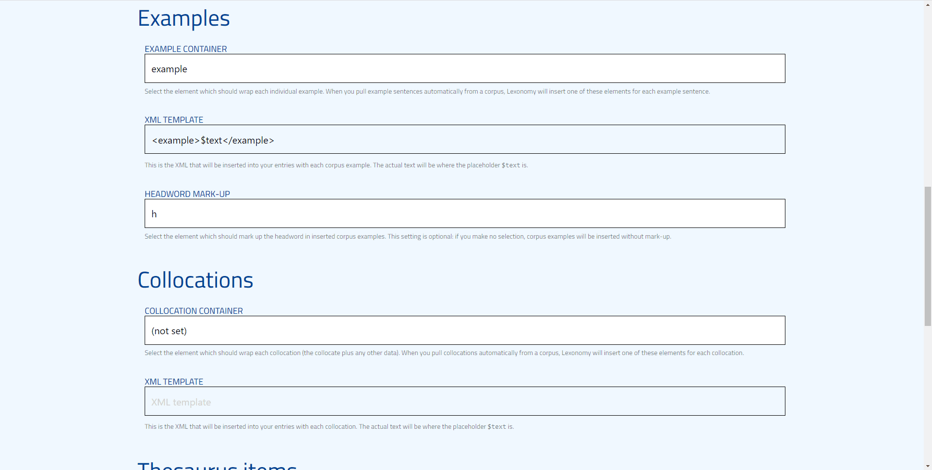 Now, we move to the specific things you can do once you have linked your Sketch Engine and Lexonomy profiles. In Lexonomy, pulling example sentences (picture below) works just as pulling collocations, thesaurus items, and definitions from Sketch Engine. In all of these cases, you need to select the element in which every example will be put (wrapped), then provide a general XML template for every example, collocation, thesaurus item or definition that will be inserted into your entries. In the case of examples, you can select the element that marks the headword, if relevant.