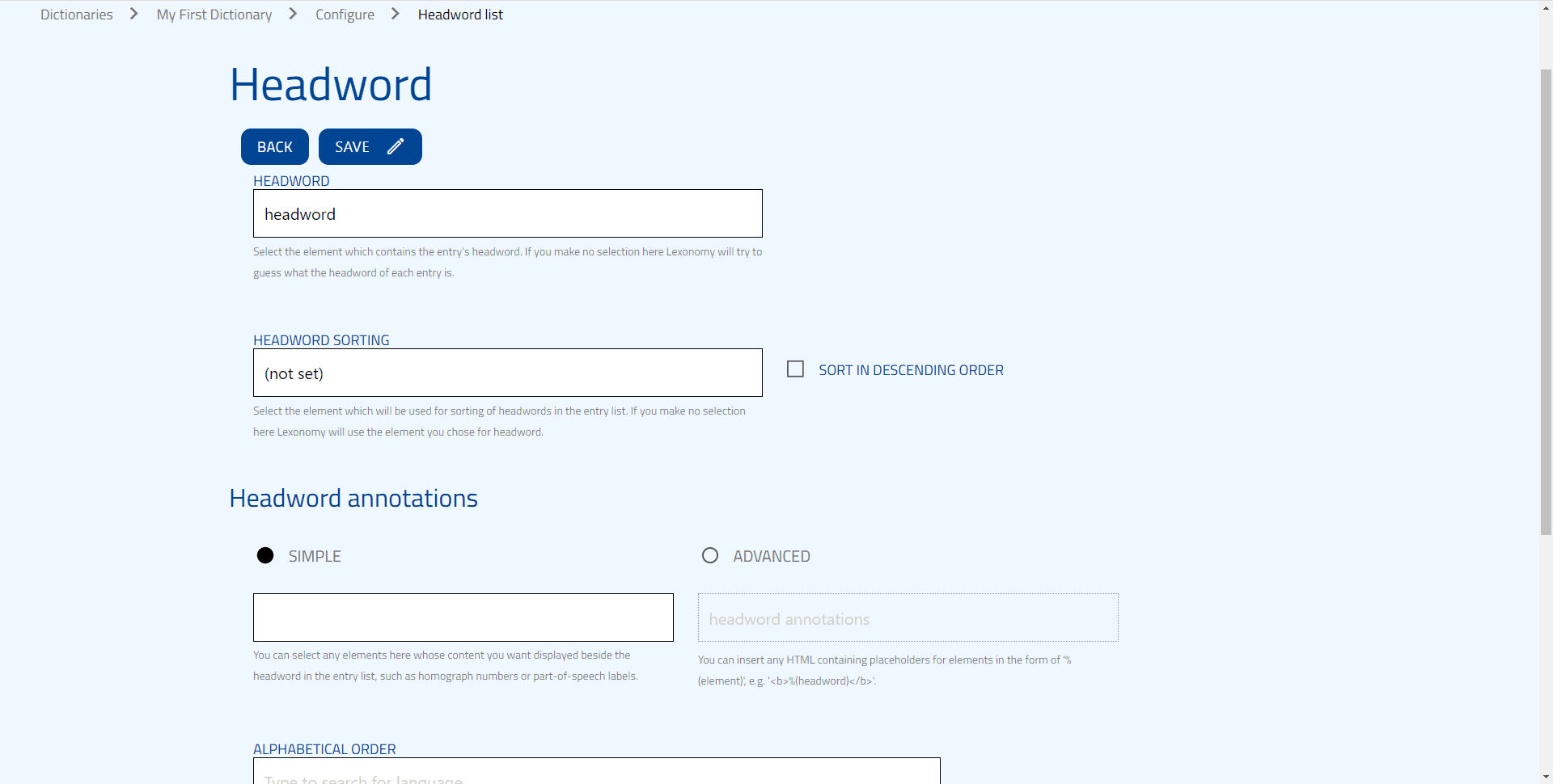 Under Headword list, you can configure the headword list and its display, and select the element that contains the entry’s headword - normally, it is the headword element, but you can change this too. You can also change how the entry list is sorted, just specify the element that should be used for sorting (e.g. part-of-speech, source, sense). You can also sort these items in a descending order. If you wish, you can display additional content besides the headword in the entry list, for example, part-of-speech labels or homograph numbers. This is also the place where you can look up any language and select its alphabet for sorting items in alphabetical order.