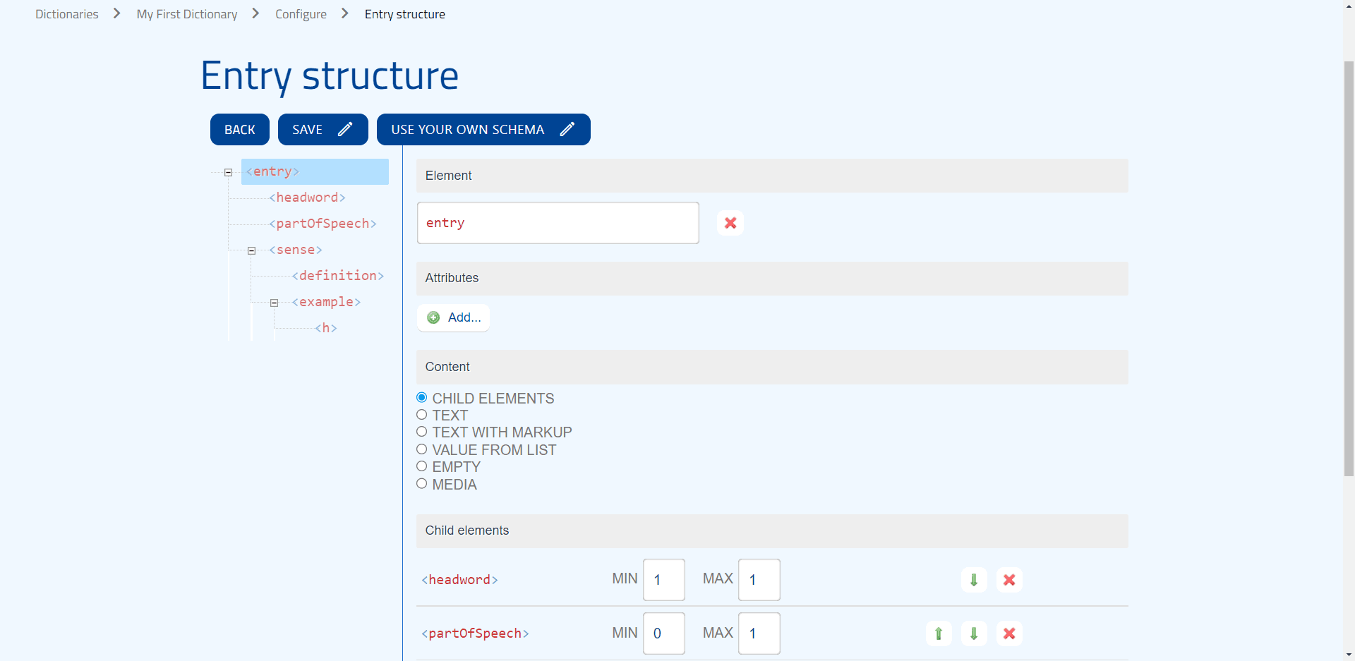Now, let’s see the Entry settings. If you click Structure, you can change the structure of the entries here, and Lexonomy will adjust its warning messages (what elements are allowed where, what content can go inside an element, etc.) to these settings.