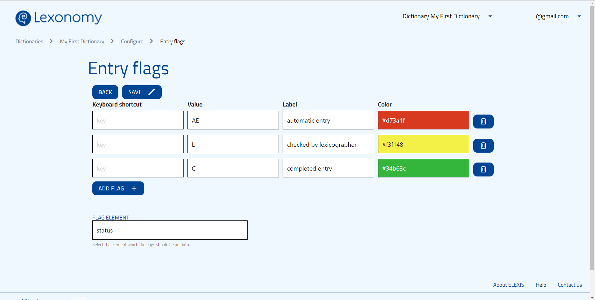 With Flags, you can flag entries to monitor their status, and thus to have a straightforward way to monitor the workflow for dictionary creation. Do this by adding an element such as <status> with workflow values, such as “AE”, “L”, and “C”, standing for “automatic entry not yet checked”, “checked by lexicographer” and “confirmed by the editor”. Then, if you select this element in the Flags section, you can specify the values the flags should consult, their labels, and how they will be visualised (colours). If you click on the flag circle next to an entry, you can see its status label and change it.