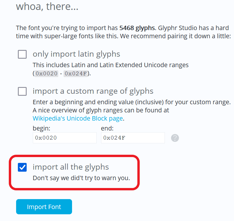 - Load the file KompLettR.ttf you find here into Glyphr Studio and make sure you choose to import all glyphs:
