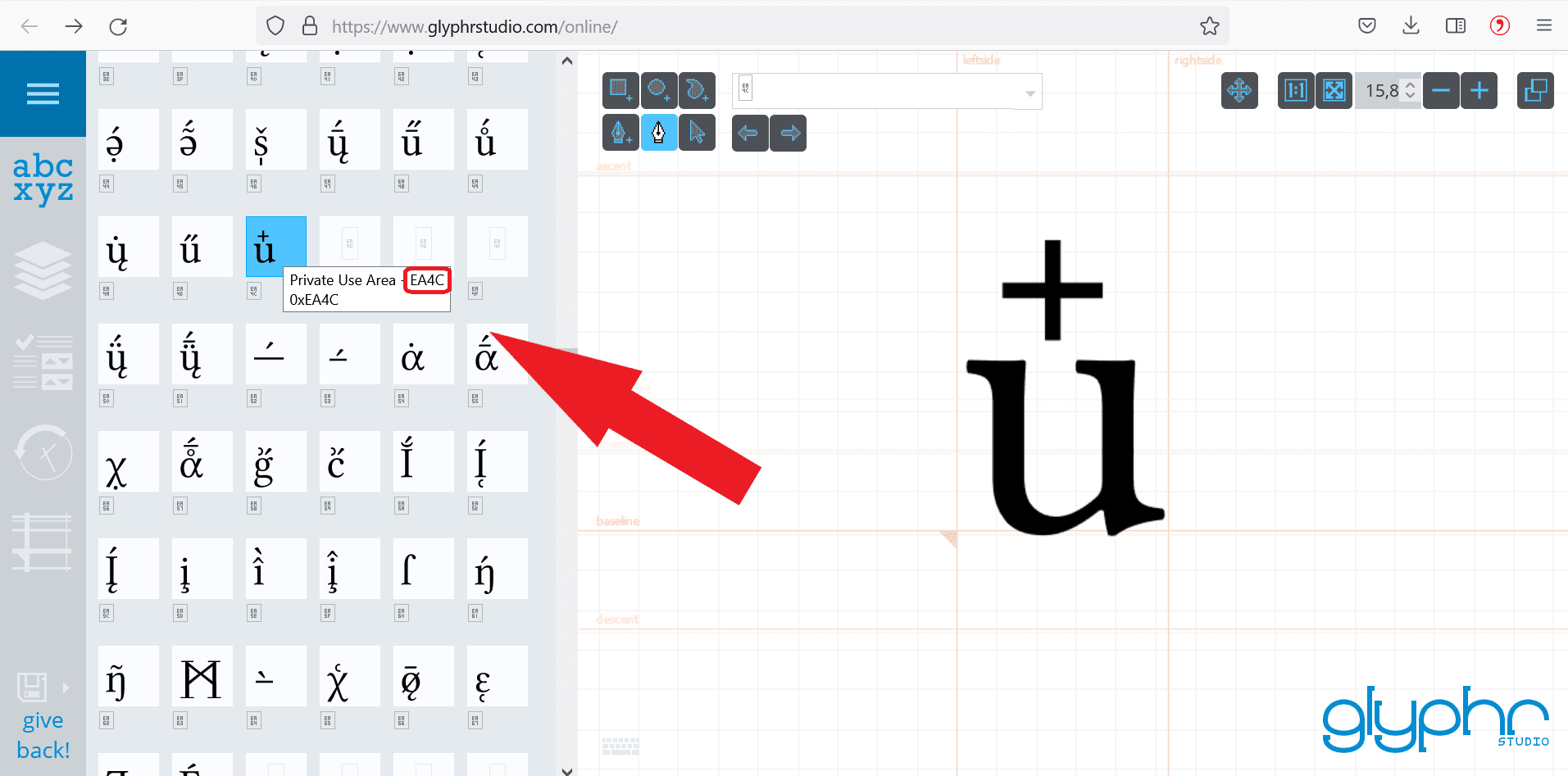 - When you have found your desired character in the overview, find out its position. To do this, move the mouse over the character. The position is displayed in a mouseover after the string “Private Use Area”. In the following example it is “EA4C”.