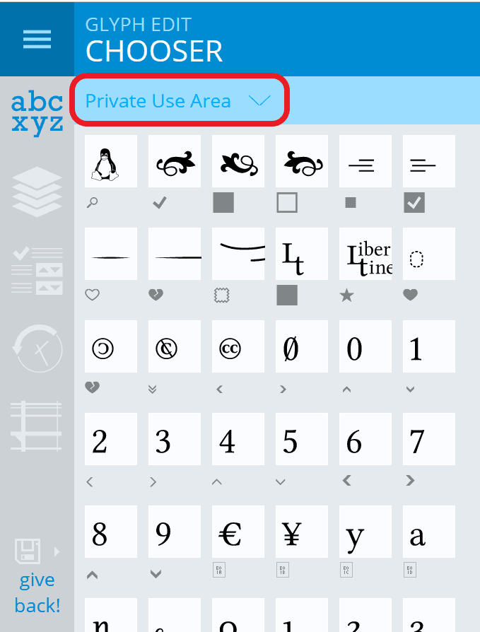 - After the file has been loaded, you can view the font characters it contains. The special characters defined in the allEntities file are located in the Private Use Area of the font. Therefore, select this area for display: