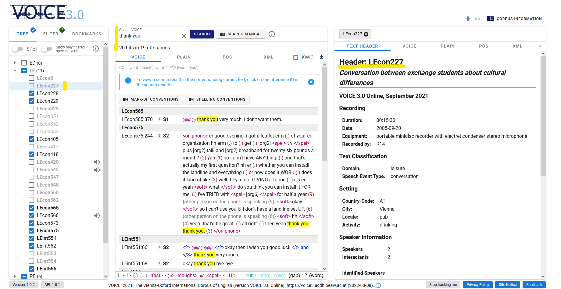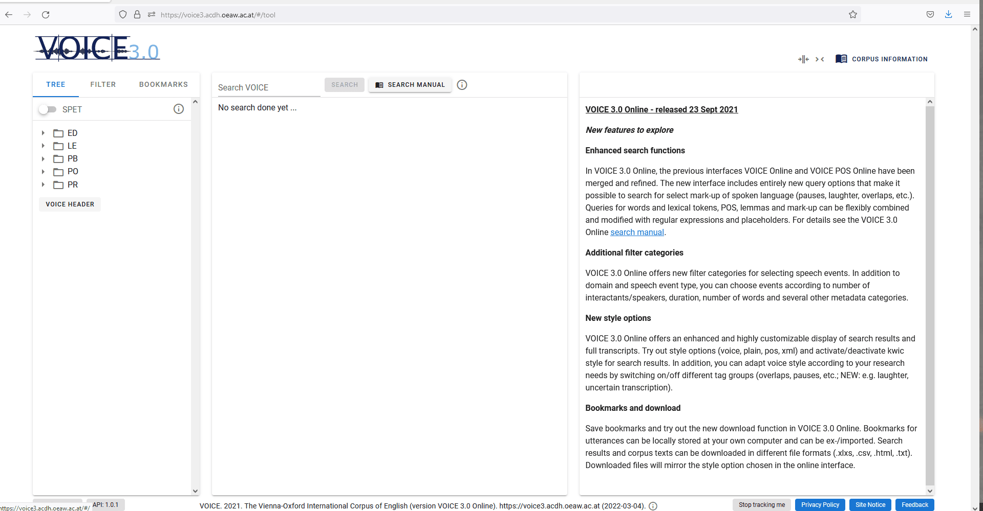 In September 2021, the VOICE CLARIAH project team developed the new VOICE 3.0 Online interface for the Vienna-Oxford International Corpus of Enlgish, VOICE. VOICE is a computerized open-access corpus of naturally-occurring,spoken English as a lingua franca (ELF) interactions, based on audio-recordings. You can access VOICE 3.0 through the web interface at https://voice3.acdh.oeaw.ac.at, and can bookmark and download your search results. The tutorial introduces the web interface, explains how to run search queries, apply filters for the creation of sub-corpora and set bookmarks. In addition, it provides short quizzes and links to short videos explaining the design and functions of the VOICE 3.0 interface. The new VOICE 3.0 is also explained in the recordings of the ACDH-CH Tool Gallery 8.1 on “Spoken corpora and open access: Usability and Technology of VOICE 3.0 Online” from April 2022.